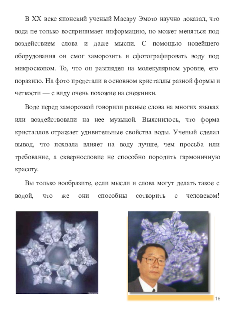 не только воспринимает информацию, но может меняться под воздействием слова и даже мысли. С помощью новейшего оборудования он смог заморозить и сфотографировать воду под микроскопом. То, что он разглядел на молекулярном уровне, его поразило. На фото предстали в основном кристаллы разной формы и четкости — с виду очень похожие на снежинки.