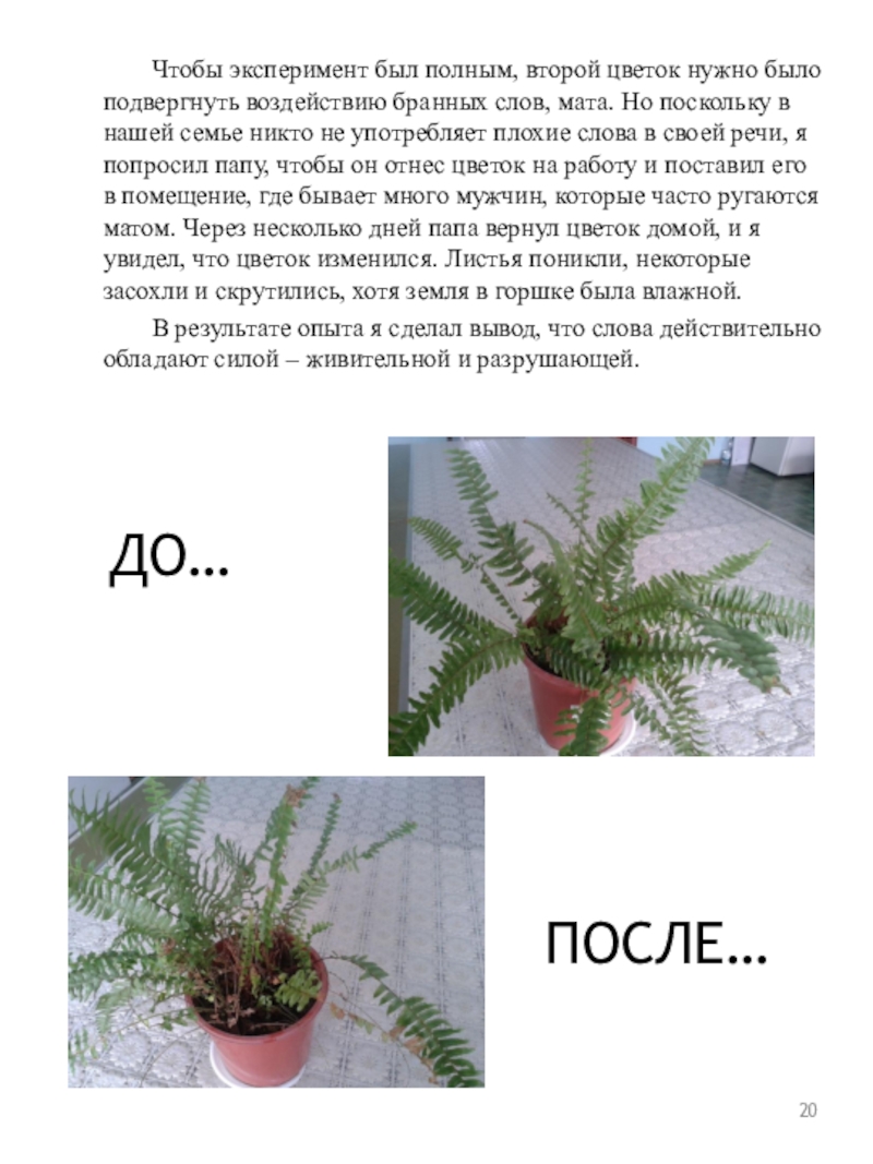 слов, мата. Но поскольку в нашей семье никто не употребляет плохие слова в своей речи, я попросил папу, чтобы он отнес цветок на работу и поставил его в помещение, где бывает много мужчин, которые часто ругаются матом. Через несколько дней папа вернул цветок домой, и я увидел, что цветок изменился. Листья поникли, некоторые засохли и скрутились, хотя земля в горшке была влажной.