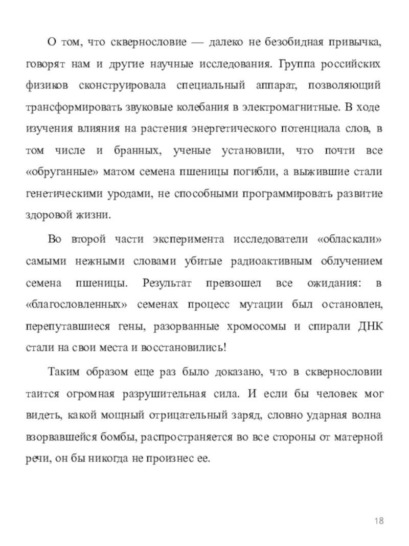 Таким образом еще раз было доказано, что в сквернословии таится огромная разрушительная сила. И если бы человек мог видеть, какой мощный отрицательный заряд, словно ударная волна взорвавшейся бомбы, распространяется во все стороны от матерной речи, он бы никогда не произнес ее.