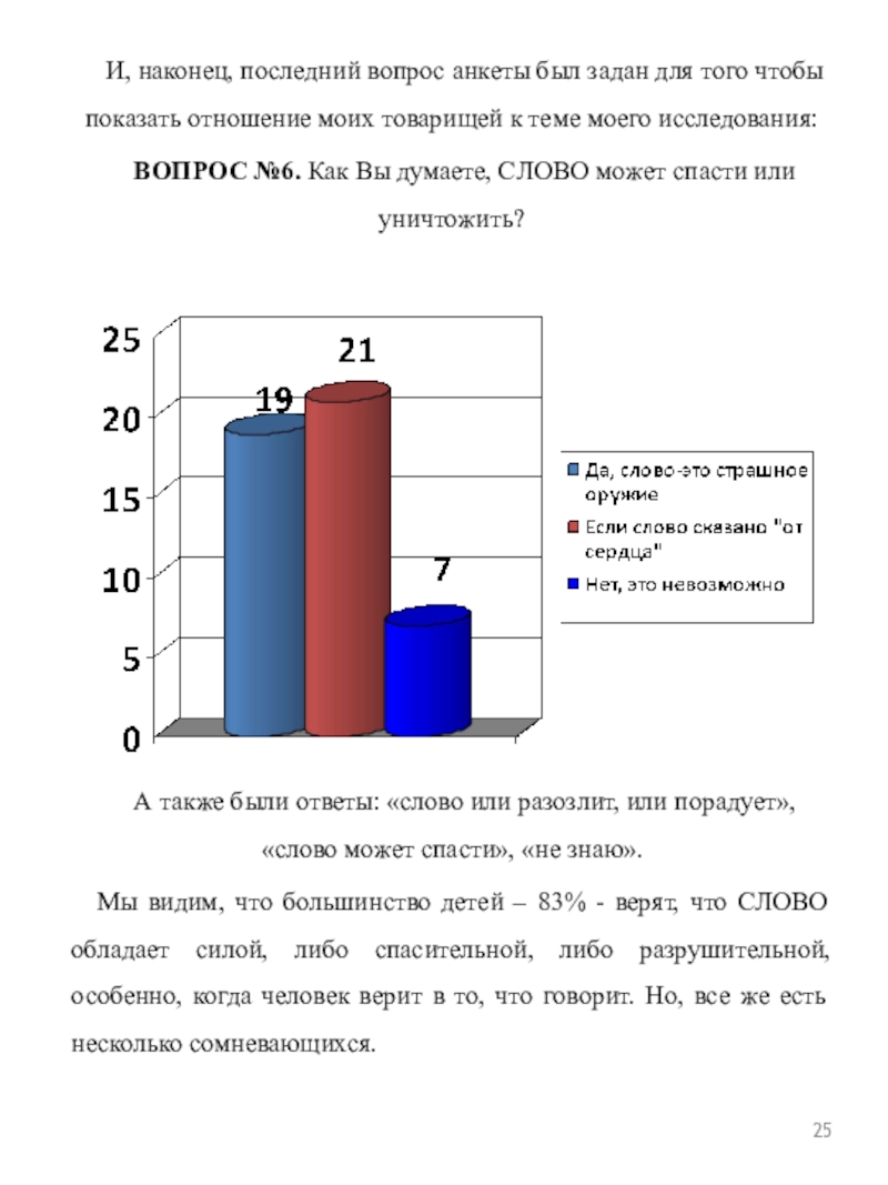 Мы видим, что большинство детей – 83% - верят, что СЛОВО обладает силой, либо спасительной, либо разрушительной, особенно, когда человек верит в то, что говорит. Но, все же есть несколько сомневающихся.