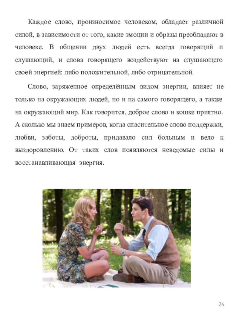 какие эмоции и образы преобладают в человеке. В общении двух людей есть всегда говорящий и слушающий, и слова говорящего воздействуют на слушающего своей энергией: либо положительной, либо отрицательной.
