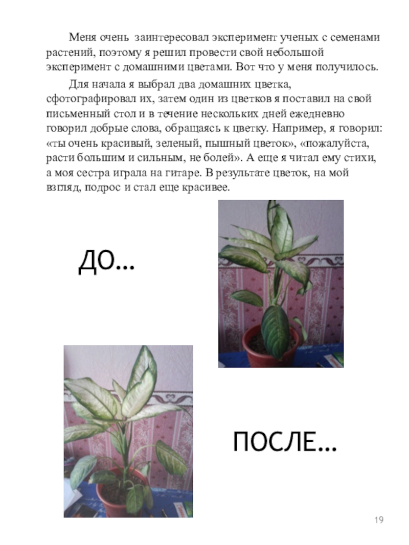Для начала я выбрал два домашних цветка, сфотографировал их, затем один из цветков я поставил на свой письменный стол и в течение нескольких дней ежедневно говорил добрые слова, обращаясь к цветку. Например, я говорил: «ты очень красивый, зеленый, пышный цветок», «пожалуйста, расти большим и сильным, не болей». А еще я читал ему стихи, а моя сестра играла на гитаре. В результате цветок, на мой взгляд, подрос и стал еще красивее.