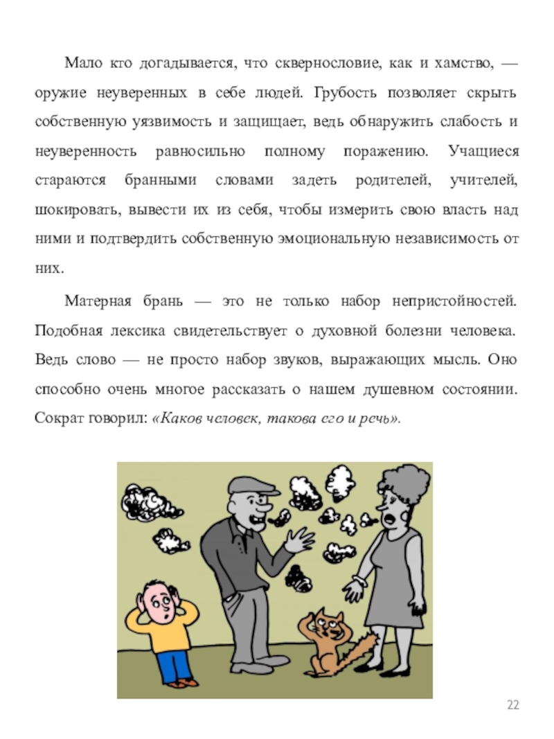 в себе людей. Грубость позволяет скрыть собственную уязвимость и защищает, ведь обнаружить слабость и неуверенность равносильно полному поражению. Учащиеся стараются бранными словами задеть родителей, учителей, шокировать, вывести их из себя, чтобы измерить свою власть над ними и подтвердить собственную эмоциональную независимость от них.
