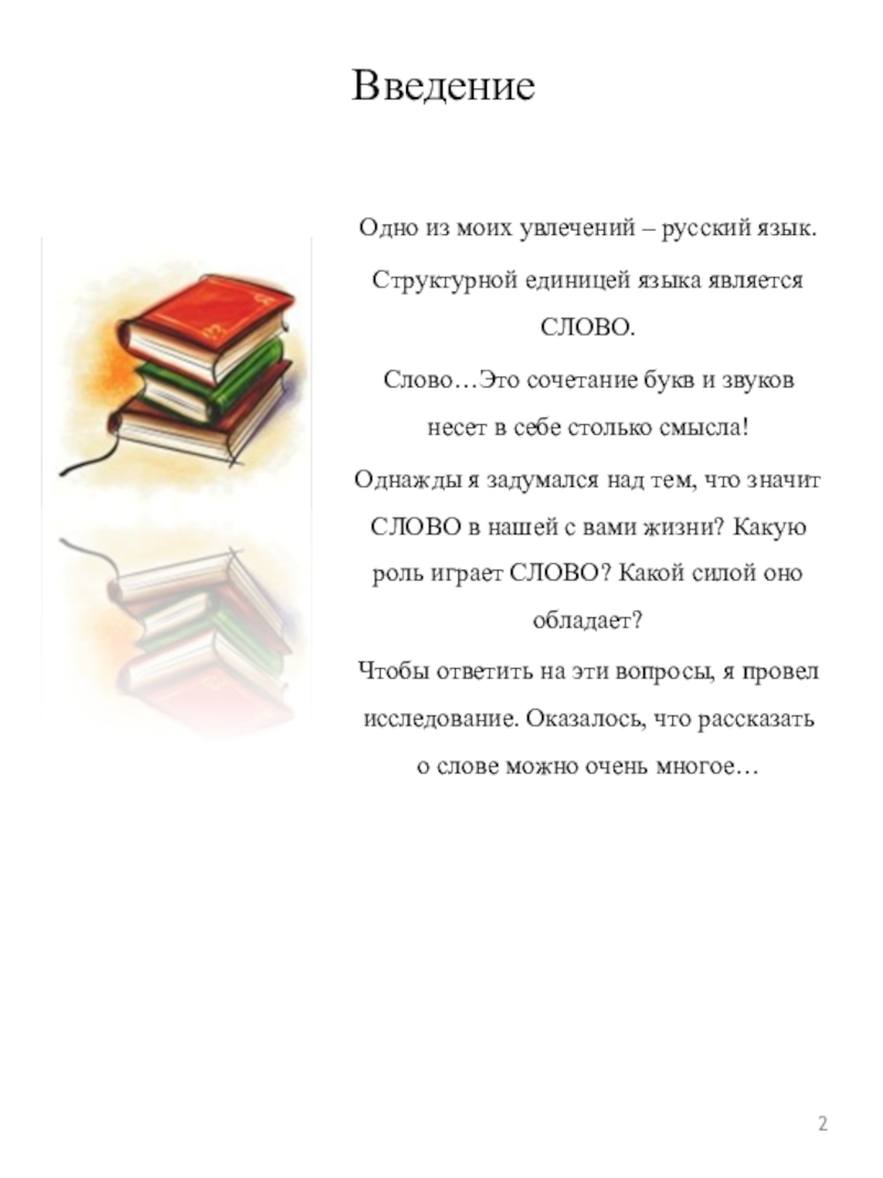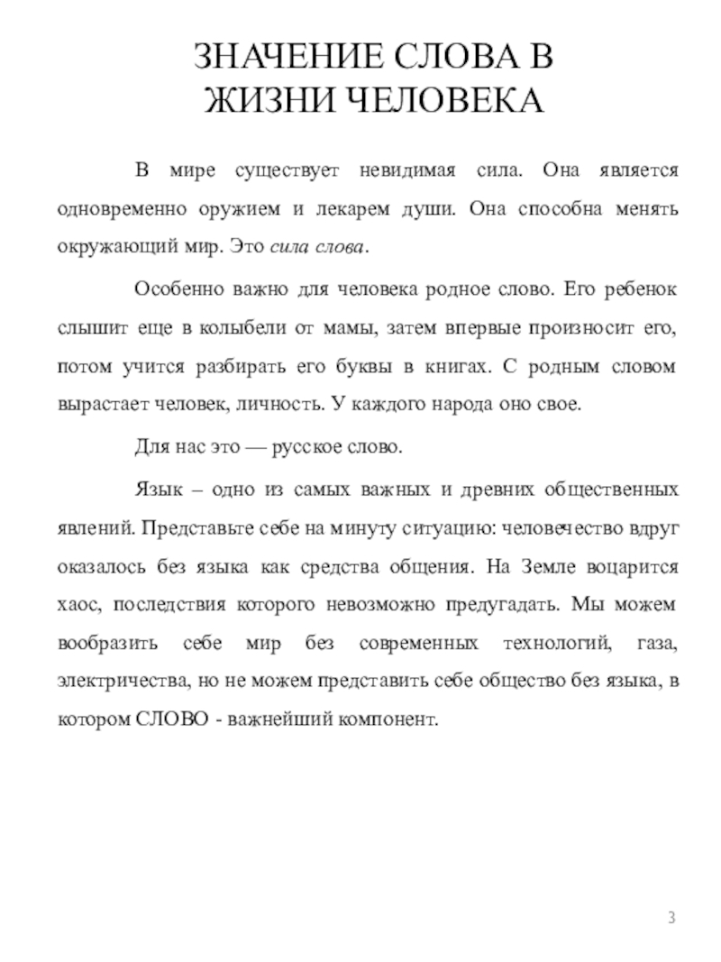Язык – одно из самых важных и древних общественных явлений. Представьте себе на минуту ситуацию: человечество вдруг оказалось без языка как средства общения. На Земле воцарится хаос, последствия которого невозможно предугадать. Мы можем вообразить себе мир без современных технологий, газа, электричества, но не можем представить себе общество без языка, в котором СЛОВО - важнейший компонент.