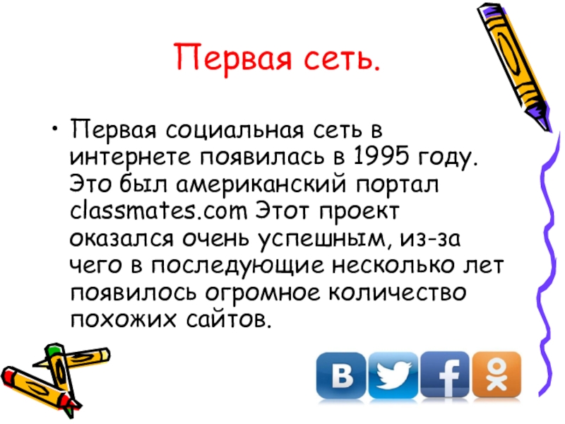 был американский портал classmates.com Этот проект оказался очень успешным, из-за чего в последующие несколько лет появилось огромное количество похожих сайтов.