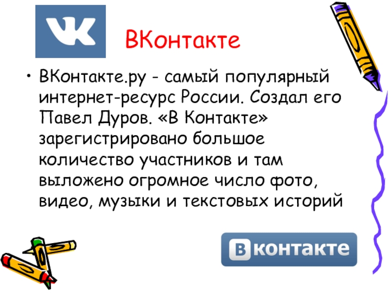ВКонтакте.ру - самый популярный интернет-ресурс России. Создал его Павел Дуров.