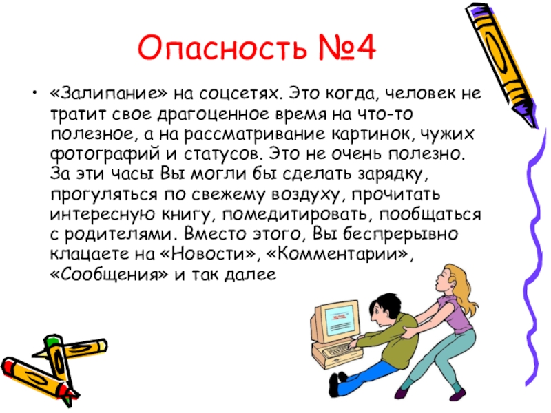 время на что-то полезное, а на рассматривание картинок, чужих фотографий и статусов. Это не очень полезно. За эти часы Вы могли бы сделать зарядку, прогуляться по свежему воздуху, прочитать интересную книгу, помедитировать, пообщаться с родителями. Вместо этого, Вы беспрерывно клацаете на «Новости», «Комментарии», «Сообщения» и так далее