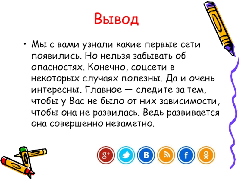 забывать об опасностях. Конечно, соцсети в некоторых случаях полезны. Да и очень интересны. Главное — следите за тем, чтобы у Вас не было от них зависимости, чтобы она не развилась. Ведь развивается она совершенно незаметно.