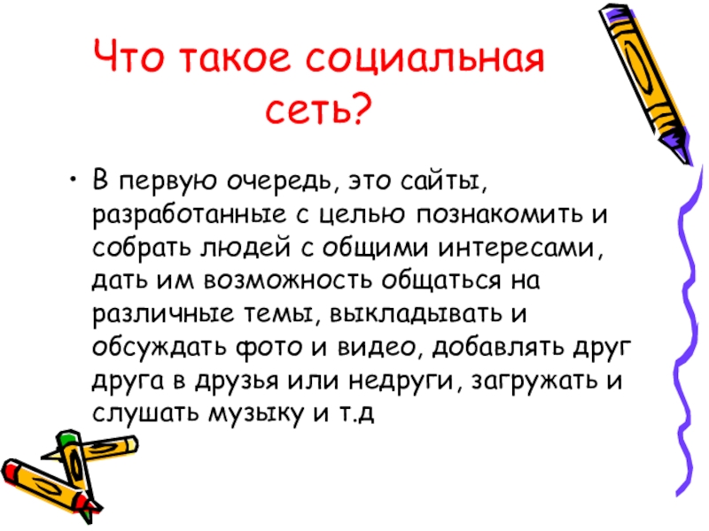 познакомить и собрать людей с общими интересами, дать им возможность общаться на различные темы, выкладывать и обсуждать фото и видео, добавлять друг друга в друзья или недруги, загружать и слушать музыку и т.д