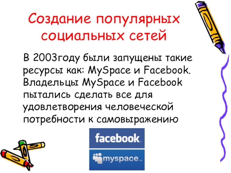 как: MySpace и Facebook. Владельцы MySpace и Facebook пытались сделать все для удовлетворения человеческой потребности к самовыражению