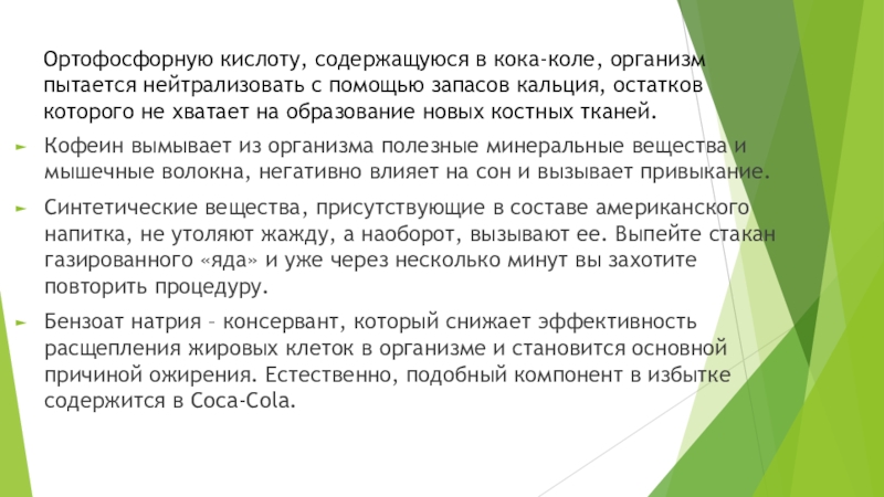 Бензоат натрия – консервант, который снижает эффективность расщепления жировых клеток в организме и становится основной причиной ожирения. Естественно, подобный компонент в избытке содержится в Coca-Cola.