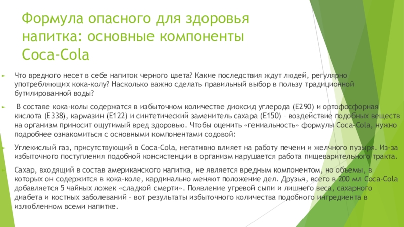 Синтетические вещества, присутствующие в составе американского напитка, не утоляют жажду, а наоборот, вызывают ее. Выпейте стакан газированного «яда» и уже через несколько минут вы захотите повторить процедуру.
