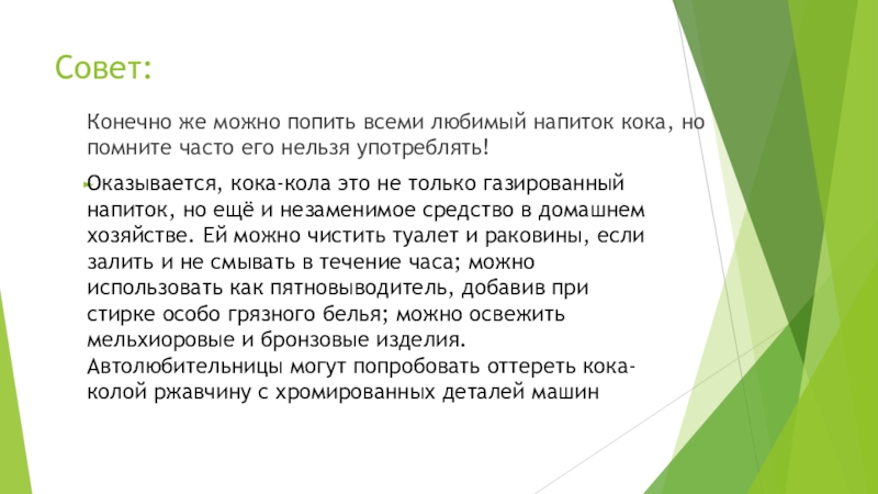 Оказывается, кока-кола это не только газированный напиток, но ещё и незаменимое средство в домашнем хозяйстве. Ей можно чистить туалет и раковины, если залить и не смывать в течение часа; можно использовать как пятновыводитель, добавив при стирке особо грязного белья; можно освежить мельхиоровые и бронзовые изделия. Автолюбительницы могут попробовать оттереть кока-колой ржавчину с хромированных деталей машин