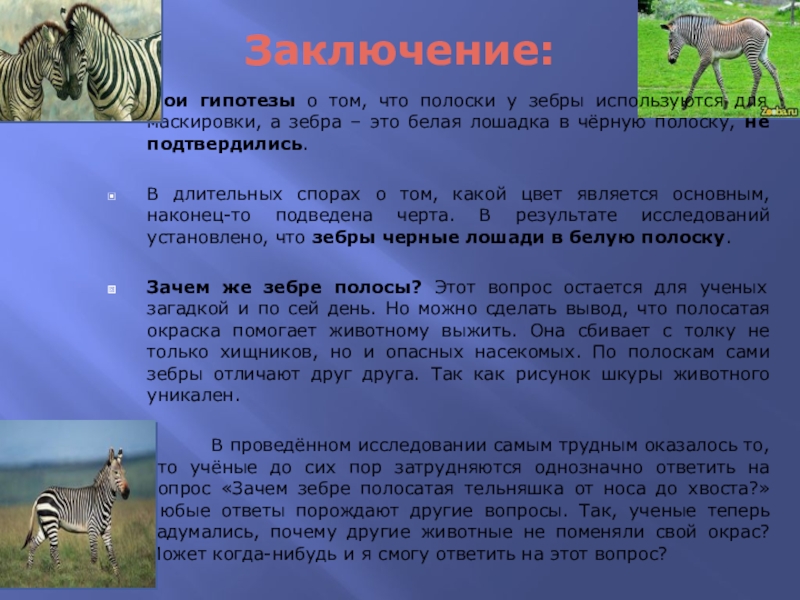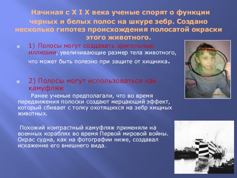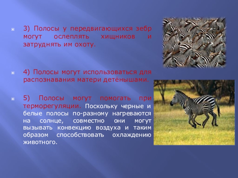 1) Полосы могут создавать зрительные иллюзии, увеличивающие размер тела животного, что может быть полезно при защите от хищника.