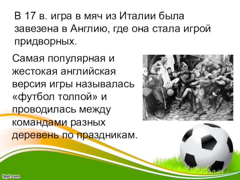 В 17 в. игра в мяч из Италии была завезена в Англию, где она стала игрой придворных.