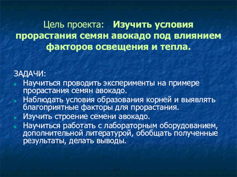 Научиться проводить эксперименты на примере прорастания семян авокадо.