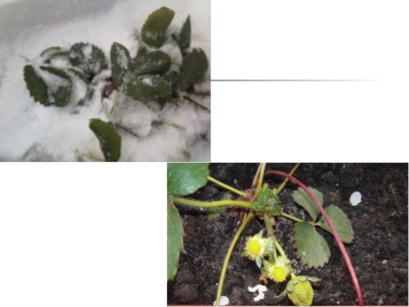 Неудовлетворительные результаты получаются и на крутом южном склоне, где быстро сходит снег и в результате клубника оголяется. Клубника - влаголюбива, но переувлажнения не переносит. Место, где растет клубника, должно быть защищенным от ветров, так как часть корневой системы вымерзает при температуре10-12°С холода, поэтому лучше она зимует под покровом снега слоем не менее 20-25 см.