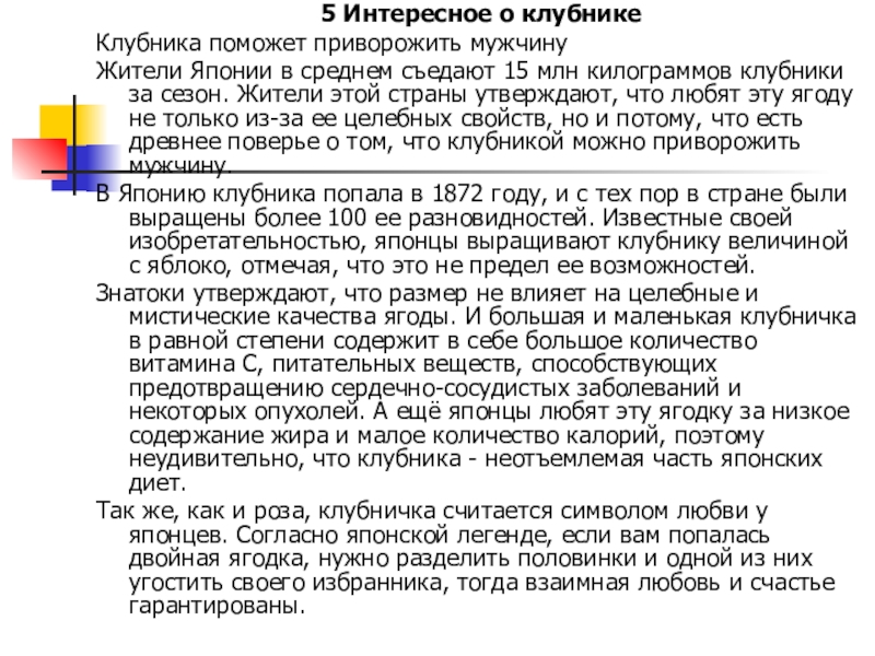 15 млн килограммов клубники за сезон. Жители этой страны утверждают, что любят эту ягоду не только из-за ее целебных свойств, но и потому, что есть древнее поверье о том, что клубникой можно приворожить мужчину.
