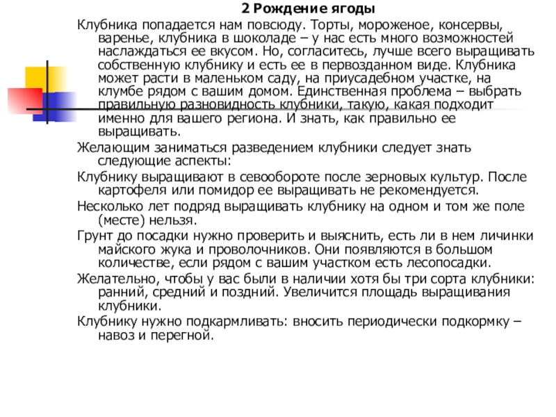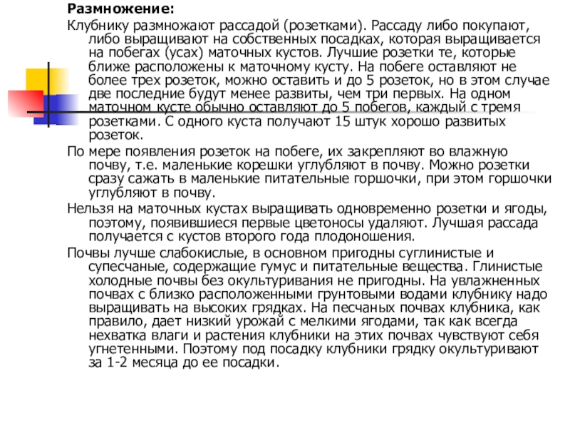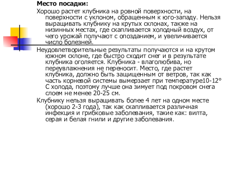 обращенным к юго-западу. Нельзя выращивать клубнику на крутых склонах, также на низинных местах, где скапливается холодный воздух, от чего урожай получают с опозданием, и увеличивается число болезней.