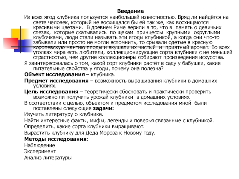 Предмет исследования – возможность выращивания клубники в домашних условиях.