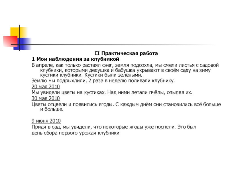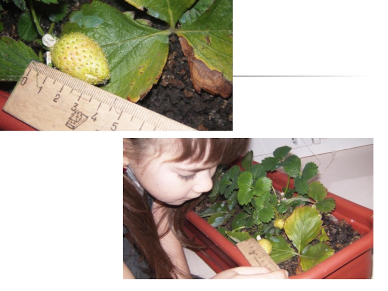 Ура! Пришло время собирать урожай. Ягоды стали красными, крупными. Они были сладкими и душистыми. Прежде чем сорвать плоды, я измерила их линейкой. Одна ягода была в длину 2см, а другая – 3см 2мм.