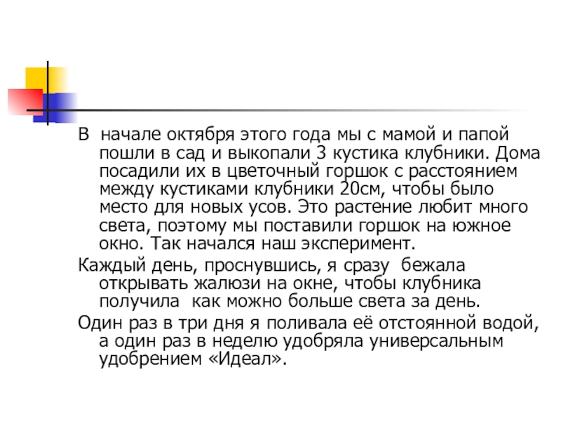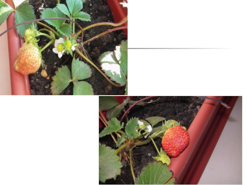 в сад и выкопали 3 кустика клубники. Дома посадили их в цветочный горшок с расстоянием между кустиками клубники 20см, чтобы было место для новых усов. Это растение любит много света, поэтому мы поставили горшок на южное окно. Так начался наш эксперимент.
