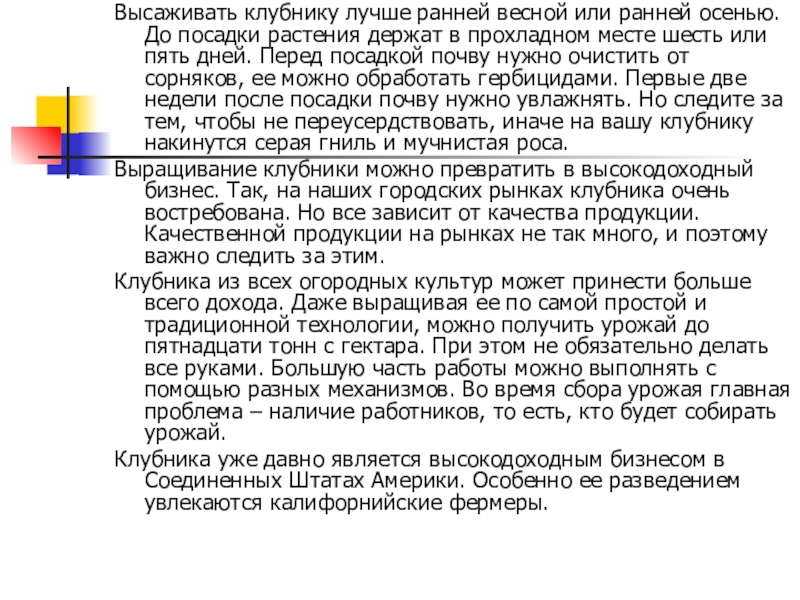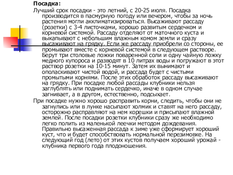 Слайд 9Высаживать клубнику лучше ранней весной или ранней осенью. До посадки растения