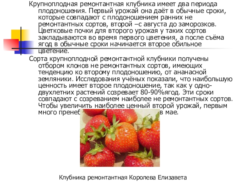 Слайд 17Крупноплодная ремонтантная клубника имеет два периода плодоношения. Первый урожай она даёт