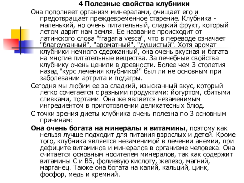 преждевременное старение. Клубника - маленький, но очень питательный, сладкий фрукт, который летом дарит нам земля. Ее название происходит от латинского слова "fragaria vesca", что в переводе означает "благоуханный", "ароматный", "душистый". Хотя аромат клубники немного сдержанный, она очень вкусная и богата на многие питательные вещества. За лечебные свойства клубнику очень ценили в древности. Более чем 3 столетия назад "курс лечения клубникой" был ли не основным при заболевании артрита и подагры.