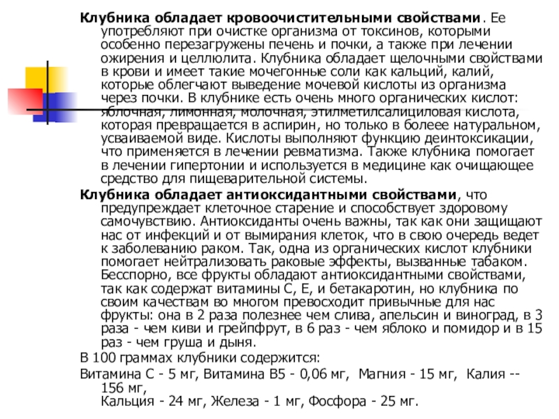 Слайд 19Клубника обладает кровоочистительными свойствами. Ее употребляют при очистке организма от токсинов,