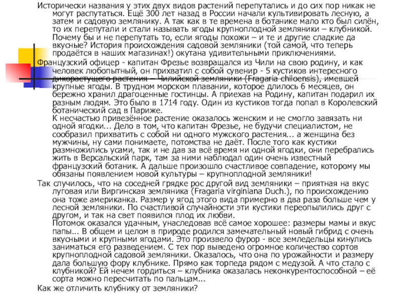 пор никак не могут распутаться. Ещё 300 лет назад в России начали культивировать лесную, а затем и садовую землянику. А так как в те времена в ботанике мало кто был силён, то их перепутали и стали называть ягоды крупноплодной земляники – клубникой. Почему бы и не перепутать то, если ягоды похожи – и те и другие сладкие да вкусные? История происхождения садовой земляники (той самой, что теперь продаётся в наших магазинах!) окутана удивительными приключениями.