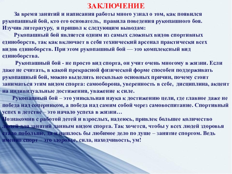 Выступив с работой на классных часах, можно привлечь большее количество детей и взрослых для занятий данным видом спорта. Ведь занятия спортом закаливают нас от различных болезней, мы становимся духовно здоровее, сильнее, увереннее.
