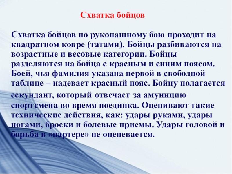 ковре (татами). Бойцы разбиваются на возрастные и весовые категории. Бойцы разделяются на бойца с красным и синим поясом. Боей, чья фамилия указана первой в свободной таблице – надевает красный пояс. Бойцу полагается секундант, который отвечает за амуницию спортсмена во время поединка. Оценивают такие технические действия, как: удары руками, удары ногами, броски и болевые приемы. Удары головой и борьба в «партере» не оценевается.
