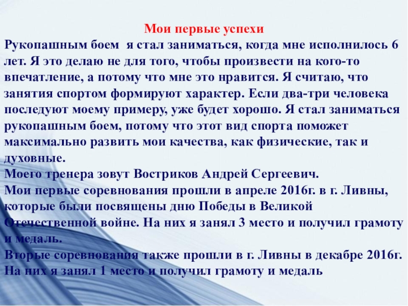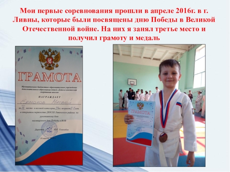 Мои первые соревнования прошли в апреле 2016г. в г. Ливны, которые были посвящены дню Победы в Великой Отечественной войне. На них я занял 3 место и получил грамоту и медаль.