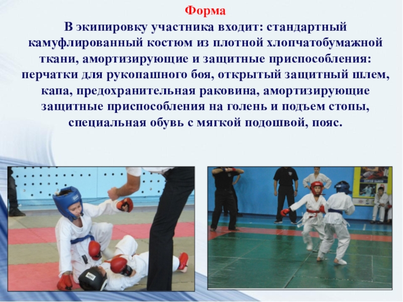 амортизирующие и защитные приспособления: перчатки для рукопашного боя, открытый защитный шлем, капа, предохранительная раковина, амортизирующие защитные приспособления на голень и подъем стопы, специальная обувь с мягкой подошвой, пояс.