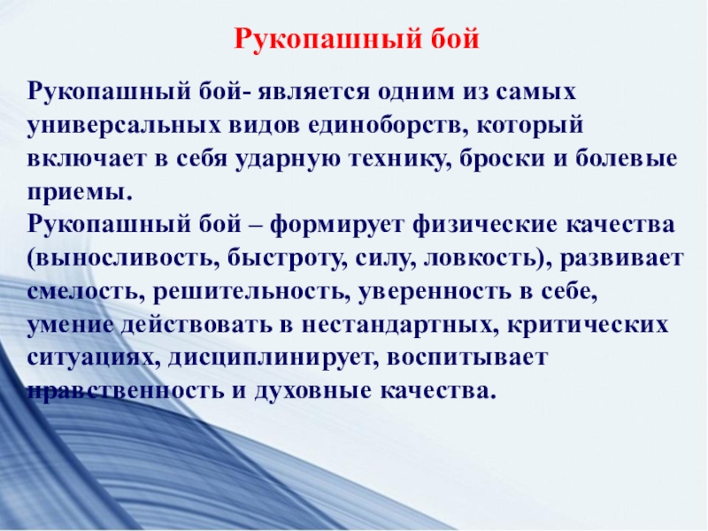 Рукопашный бой – формирует физические качества (выносливость, быстроту, силу, ловкость), развивает смелость, решительность, уверенность в себе, умение действовать в нестандартных, критических ситуациях, дисциплинирует, воспитывает нравственность и духовные качества.