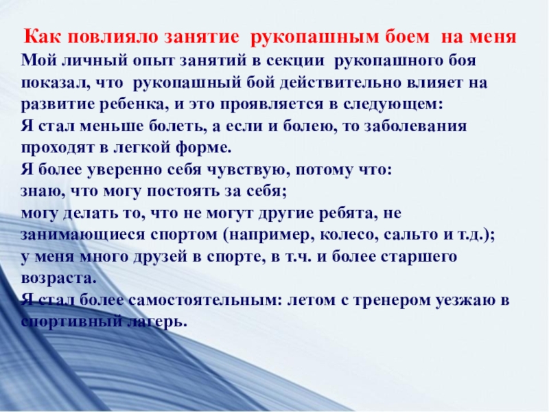 секции рукопашного боя показал, что рукопашный бой действительно влияет на развитие ребенка, и это проявляется в следующем: