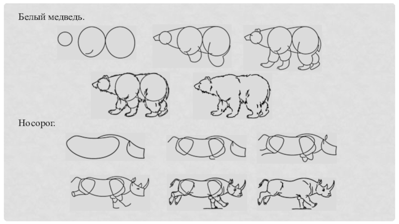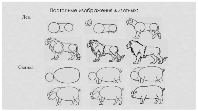 Слайд 18Поэтапные изображения животных: