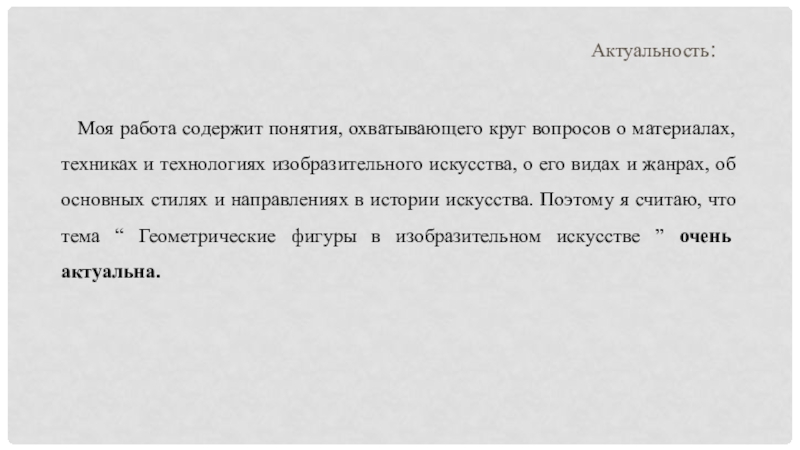 техниках и технологиях изобразительного искусства, о его видах и жанрах, об основных стилях и направлениях в истории искусства. Поэтому я считаю, что тема “ Геометрические фигуры в изобразительном искусстве ” очень актуальна.