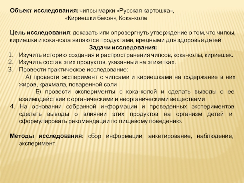 Цель исследования: доказать или опровергнуть утверждение о том, что чипсы, кириешки и кока-кола являются продуктами, вредными для здоровья детей