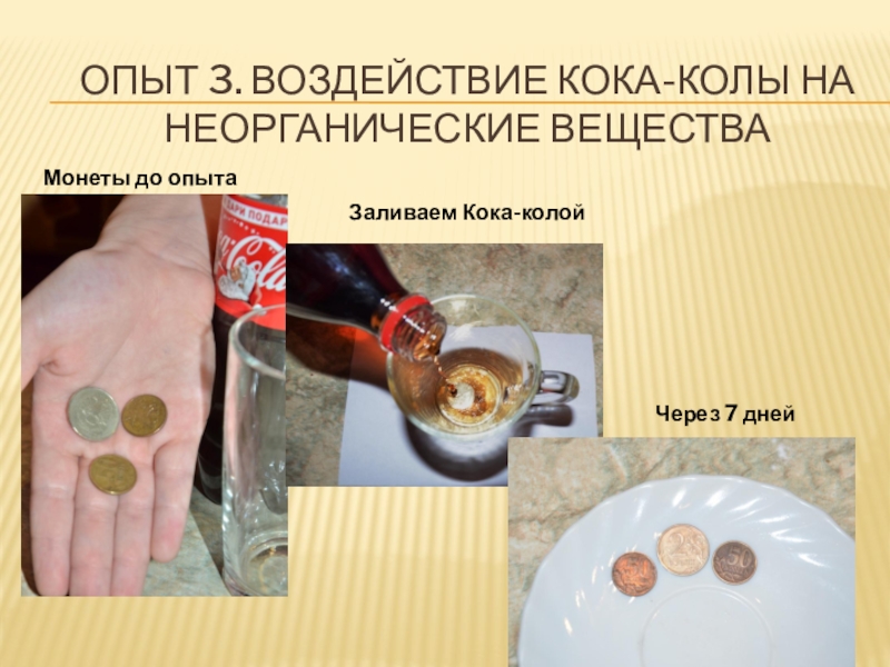 Опыт 3. Воздействие кока-колы на неорганические веществаМонеты до опытаЗаливаем Кока-колойЧерез 7 дней