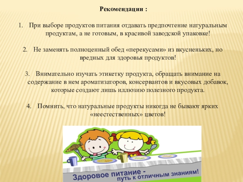 Рекомендации :При выборе продуктов питания отдавать предпочтение натуральным продуктам, а не готовым, в красивой заводской упаковке!Не заменять