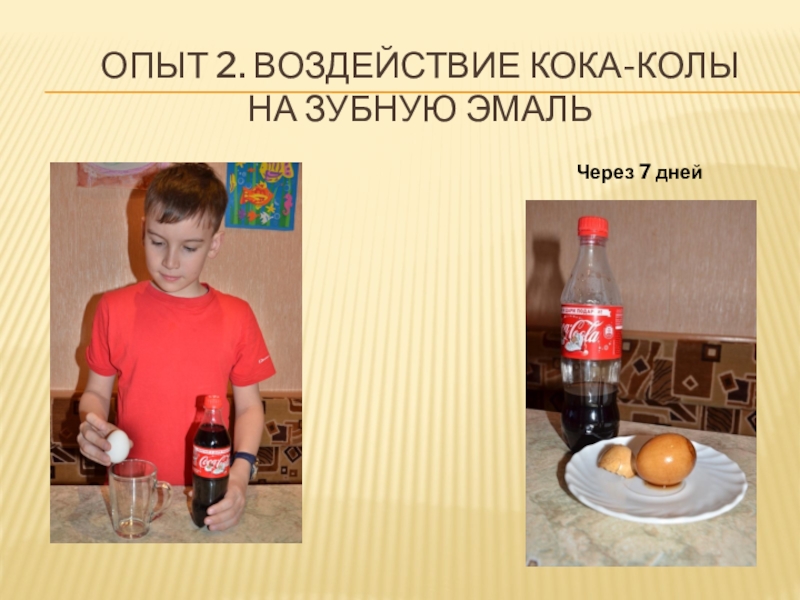 Слайд 18Опыт 2. Воздействие кока-колы на зубную эмаль