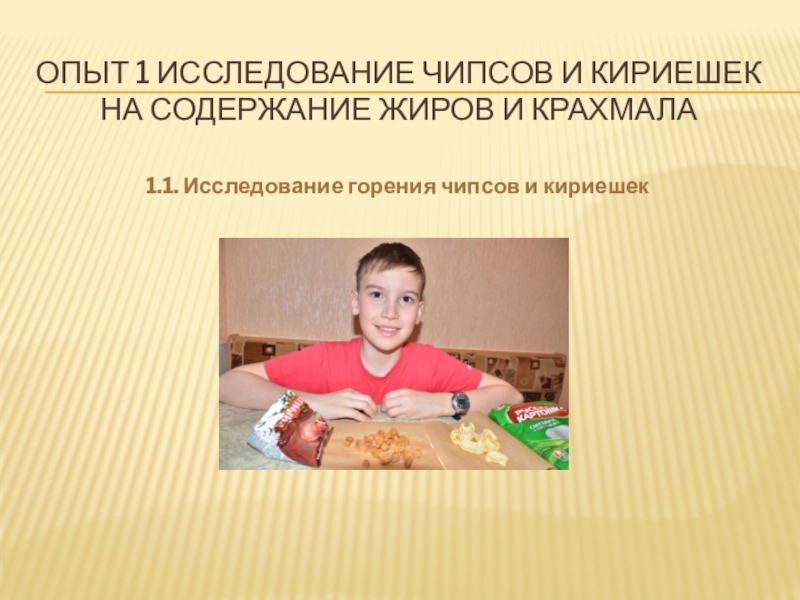 Слайд 15Опыт 1 исследование чипсов и кириешек на содержание жиров и крахмала