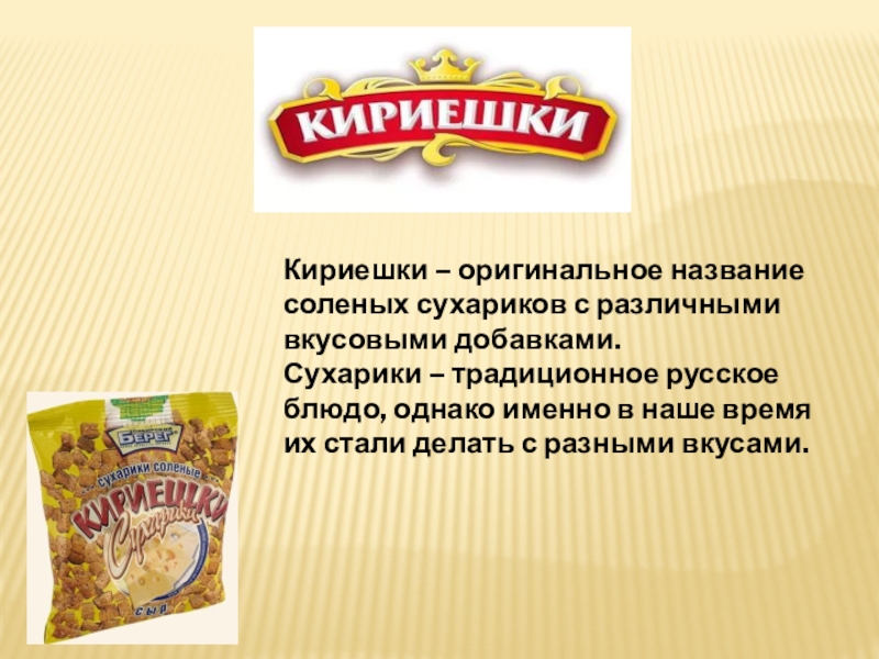 Кириешки – оригинальное название соленых сухариков с различнымивкусовыми добавками. Сухарики – традиционное русское блюдо, однако именно в