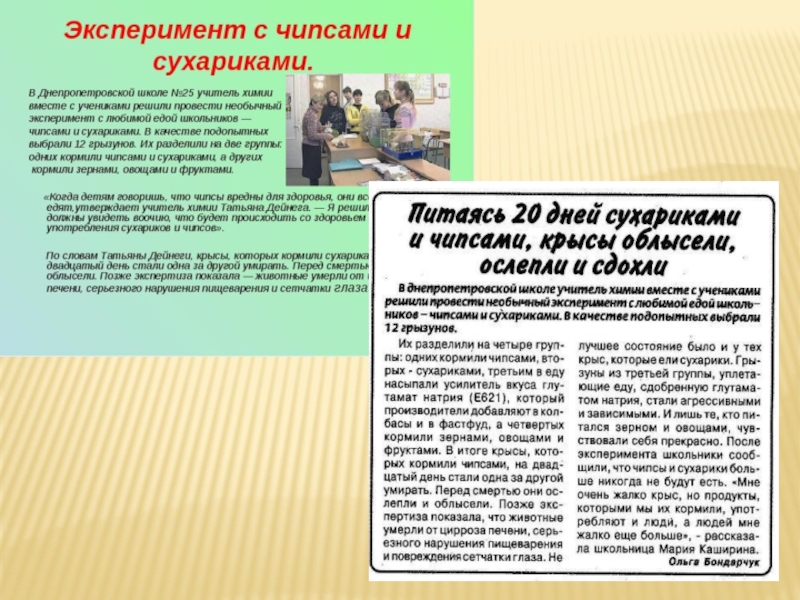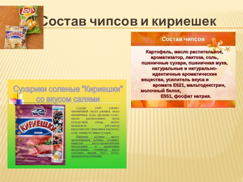 А) провести эксперимент с чипсами и кириешками на содержание в них жиров, крахмала, поваренной соли
