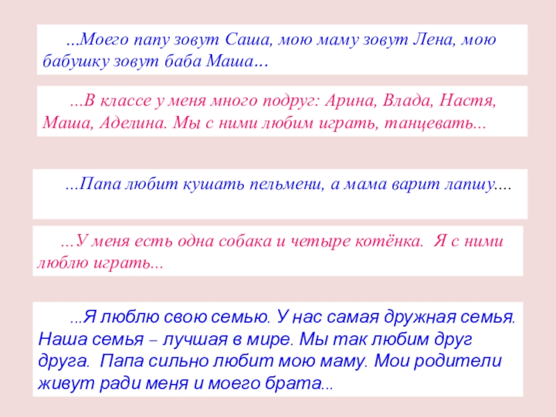 ...Моего папу зовут Саша, мою маму зовут Лена, мою бабушку зовут баба Маша...