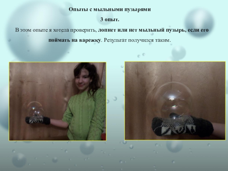 проверить, лопнет или нет мыльный пузырь, если его поймать на варежку. Результат получился таким.
