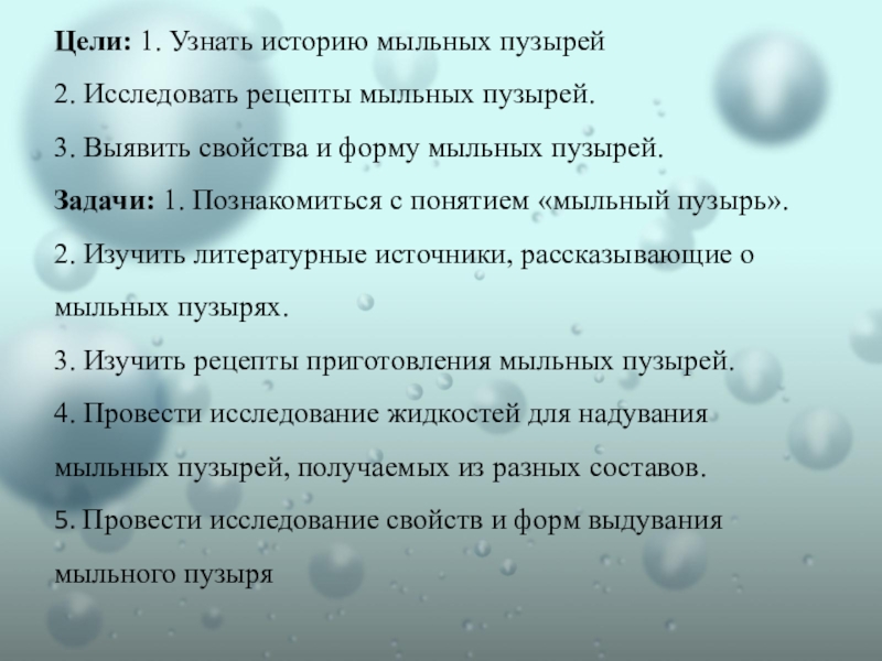 Слайд 3Цели: 1. Узнать историю мыльных пузырей
