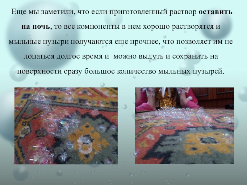 то все компоненты в нем хорошо растворятся и мыльные пузыри получаются еще прочнее, что позволяет им не лопаться долгое время и можно выдуть и сохранить на поверхности сразу большое количество мыльных пузырей.